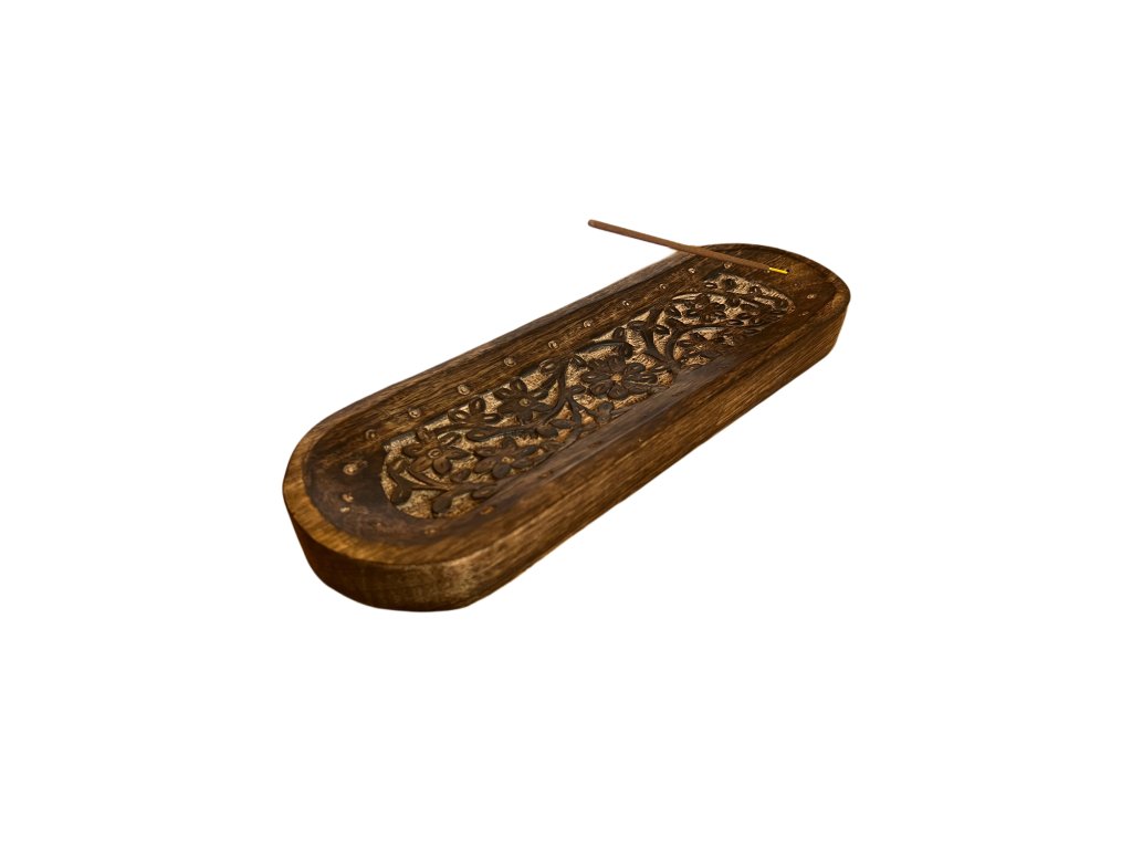 Dřevěný stojánek na vonné tyčinky ve tvaru oválu s květinovým zdobením. Dají se do něj umístit až dvě tyčinky, pěkný bytelný kousek, poslouží i jako dekorační kousek např. pod sbírku kamínků.