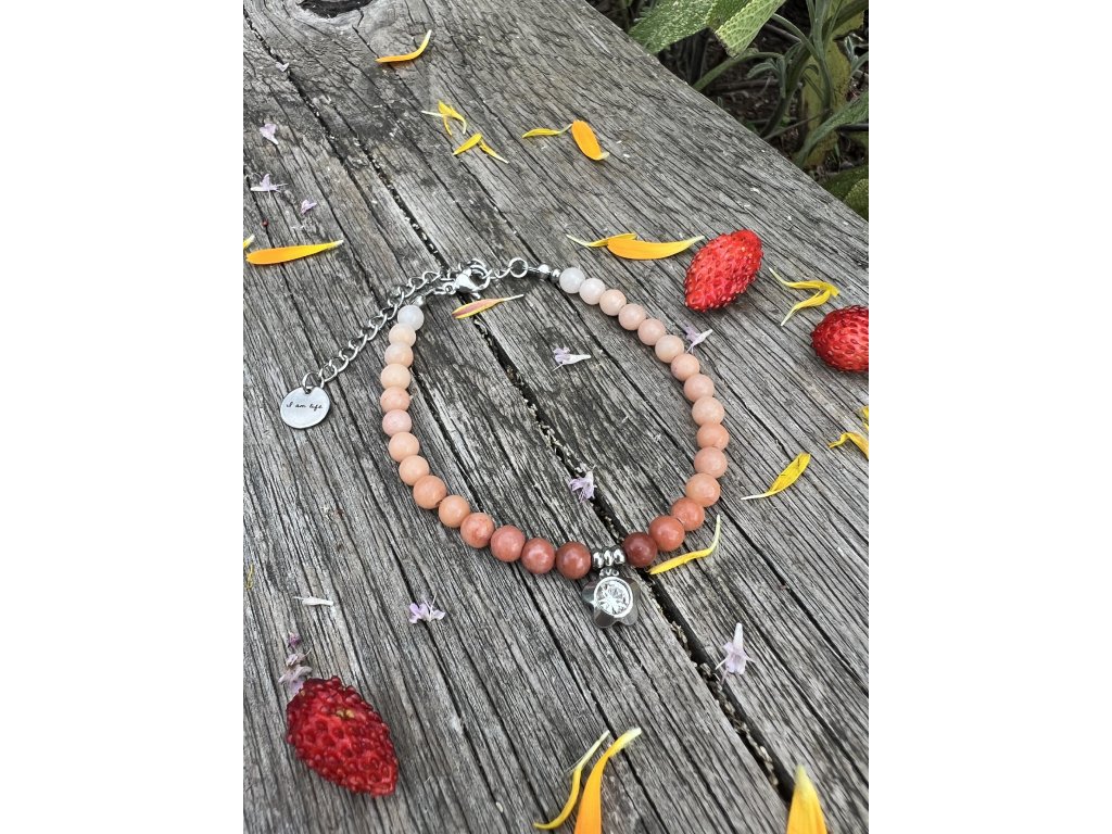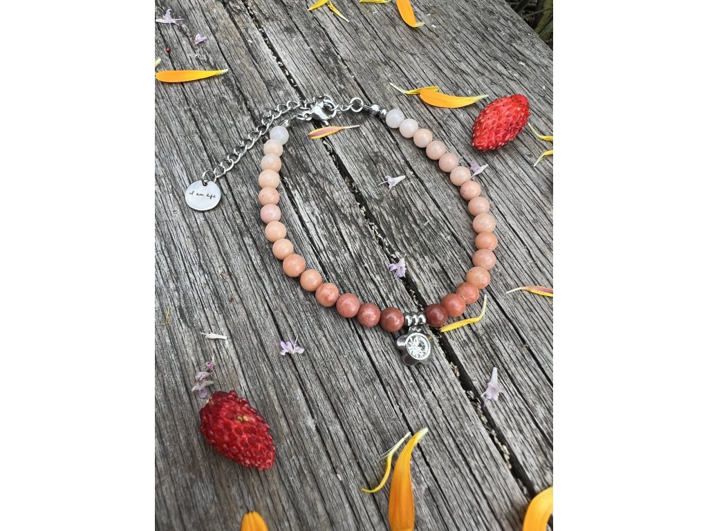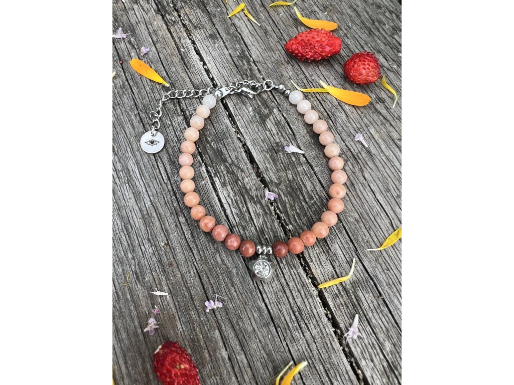 Avanturín (v náramku v oranžových tónech) působí na křížová čakru – centrum vitality, kreativity, plodnosti a tvorby, je považován za kámen radosti, hojnosti a štěstí.