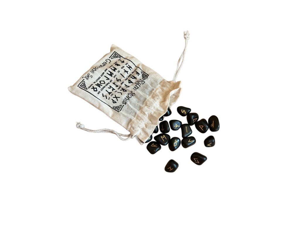 Runové kameny z černého achátu ve lněném pytlíčku.