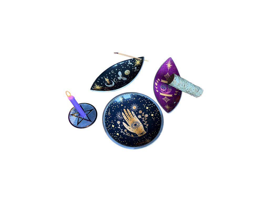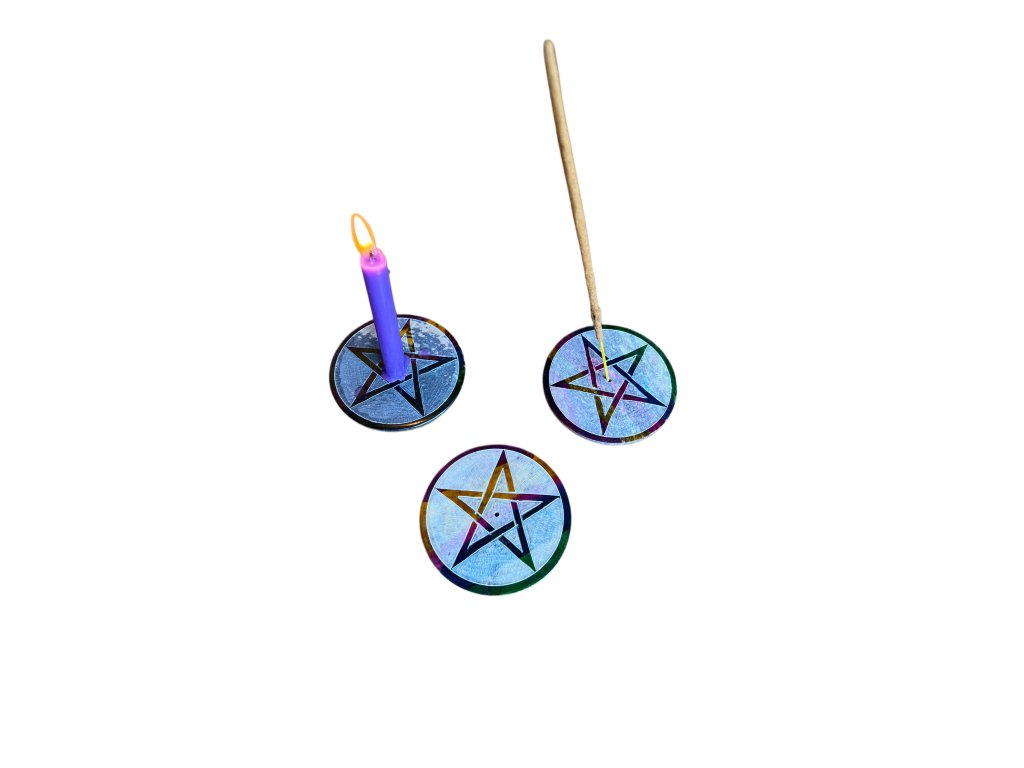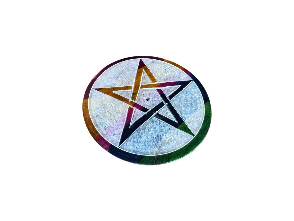 Kulatý stojánek na vonnou tyčinku se symbolem pentagramu.